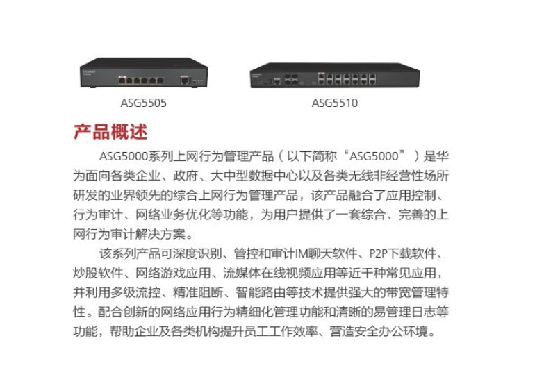 ASG5000系列上網(wǎng)行為管理產(chǎn)品(以下簡稱“ASG5000”)是華為面向各類企業(yè)、政府、大中型數(shù)據(jù)中心以及各類無線非經(jīng)營性場所推出的業(yè)界領先的綜合上網(wǎng)行為管理產(chǎn)品。