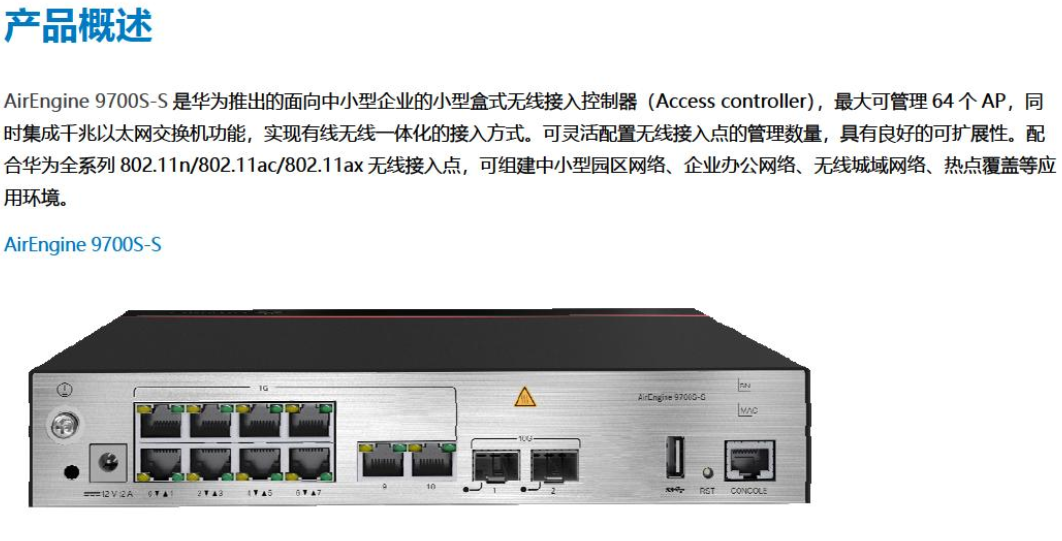 AirEngine 9700S-S是華為推出的面向中小型企業(yè)的小型盒式無線接入控制器(Access controller),最大可管理64個AP,同時集成千兆以太網(wǎng)交換機(jī)功能,實現(xiàn)有線無線一體化的接入方式??伸`活配置無線接入點的管理數(shù)量,具有良好的可擴(kuò)展性。配合華為全系列802.11n/802.11ac/802.11ax無線接入點,可組建中小型園區(qū)網(wǎng)絡(luò)、企業(yè)辦公網(wǎng)絡(luò)、無線城域網(wǎng)絡(luò)、熱點覆蓋等應(yīng)用環(huán)境。