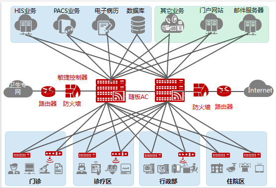 內(nèi)網(wǎng):也稱為HIS網(wǎng)絡(luò),主要承載醫(yī)療核心業(yè)務(wù),如HIS、LIS、PACS等業(yè)務(wù)數(shù)據(jù)傳輸,要求高寬帶、大容量和高速率,并需考慮未來(lái)擴(kuò)容、帶寬升級(jí)。