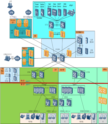 工管網(wǎng)設(shè)備按照指定VLAN+IP對(duì)應(yīng)接入,WAN網(wǎng)和分支接入用戶可訪問(wèn)一定的資源。